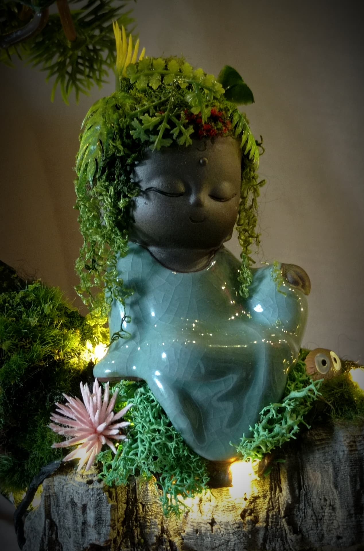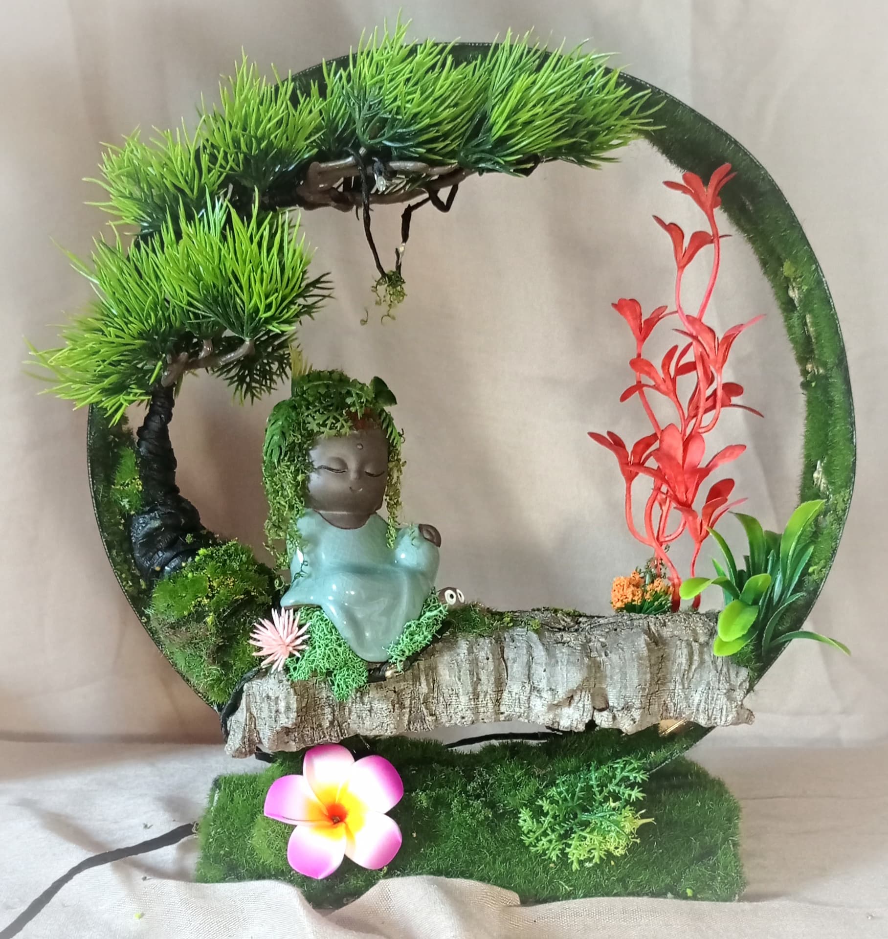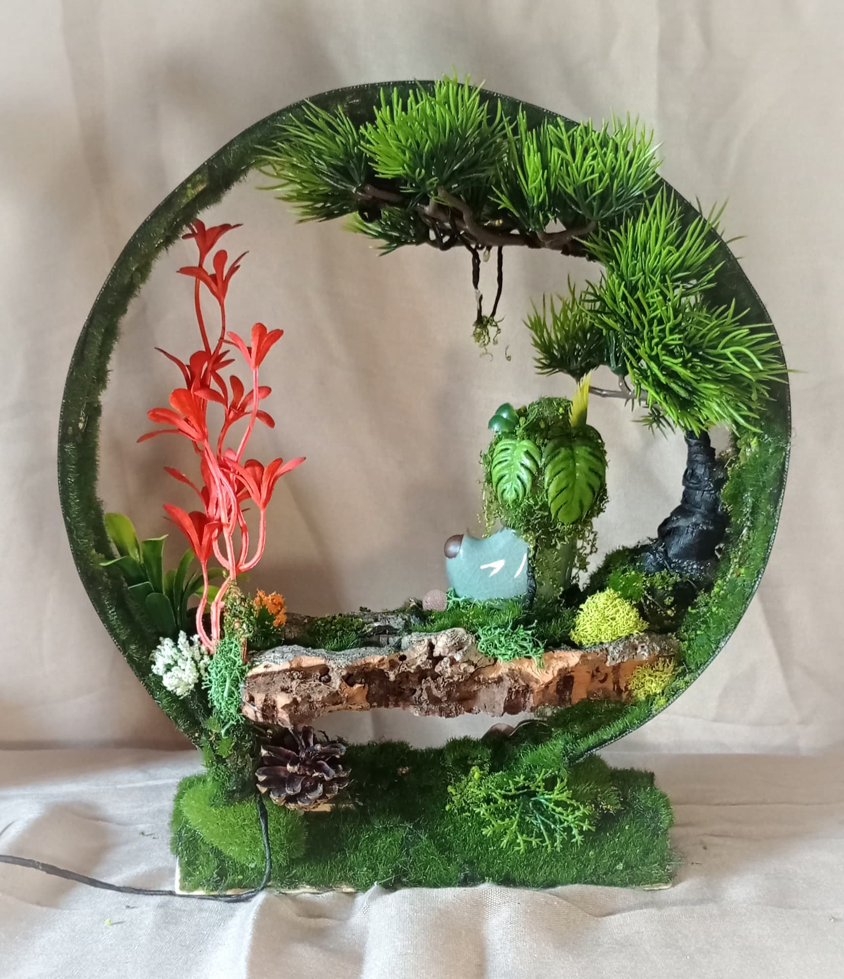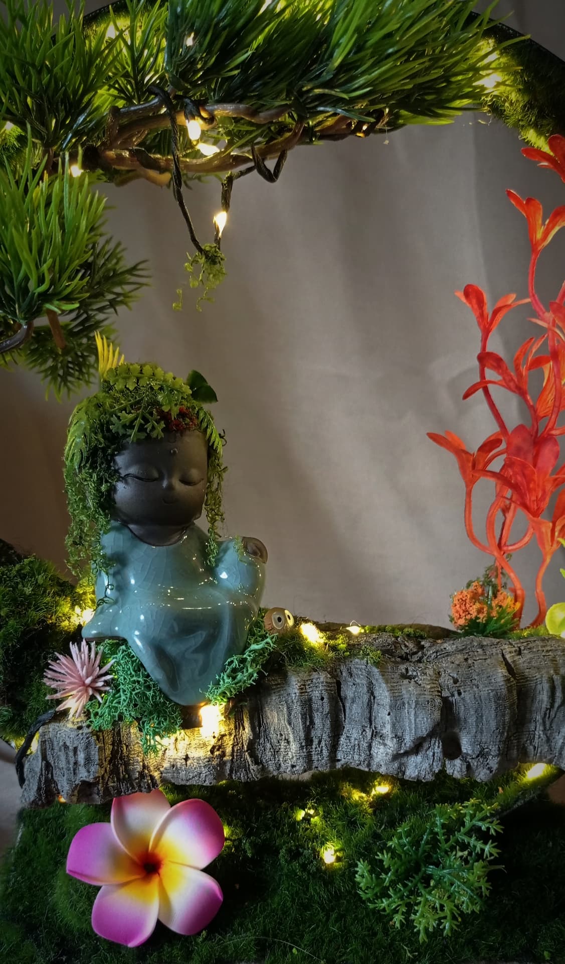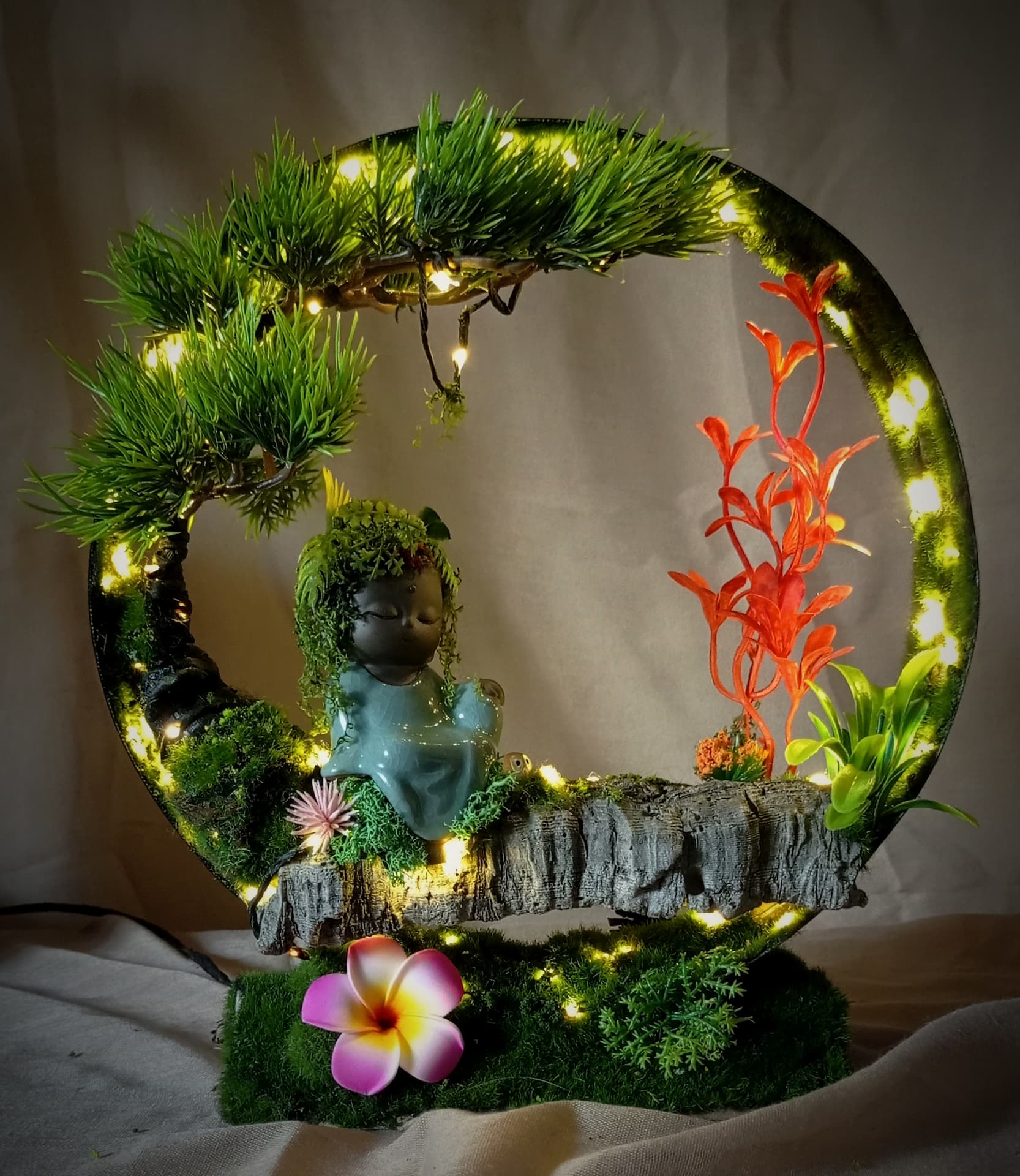 Support en bois, écorce de chêne liège, cercle en bois clair,chant en bois foncé,guirlande USB, végétaux artificiels,pomme de pin,personnage zen en céramique,mini esprit de la forêt phosphorescent.